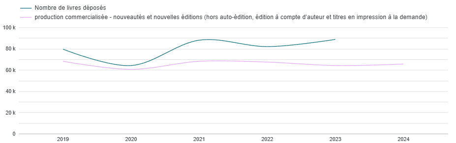 Ici ne sont comptabilisés que les titres commercialisés hors autoédition, édition à compte d’auteur et titres en impression à la demande. C’est pour ça que le nombres de titres déposés est supérieur au nombre de titres commercialisés.